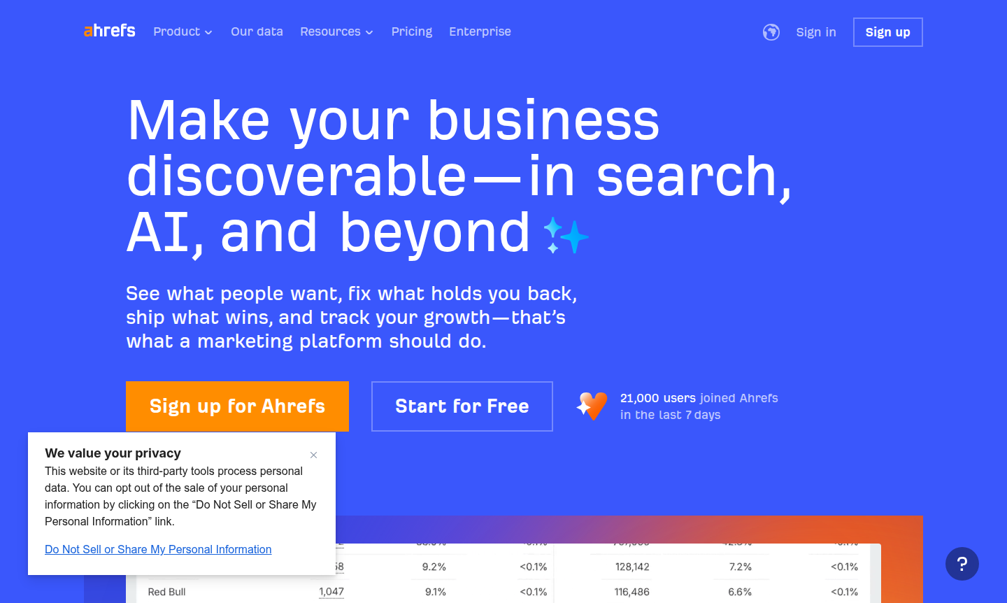 Ahrefs is a marketing intelligence platform with SEO tools for keyword research, backlink analysis, competitor intelligence, and AI features. Trusted by Fortune 500 companies.