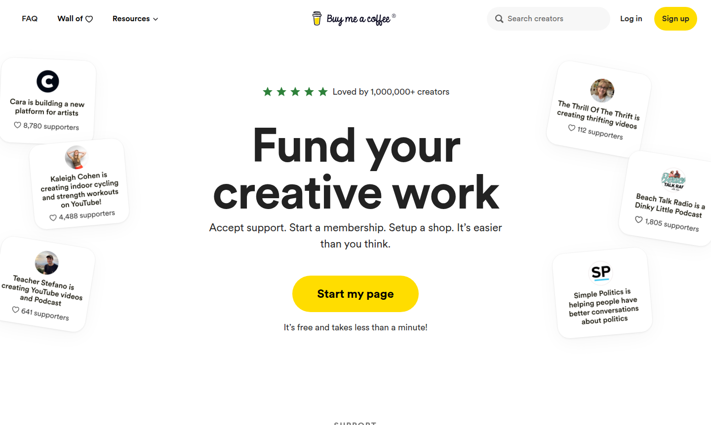 Free to start with no upfront costs, takes less than a minute to set up. Allows creators to accept one-time coffee donations and create a basic presen