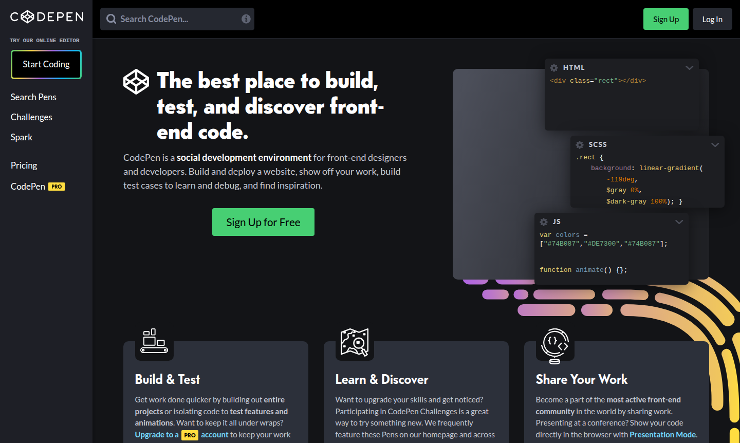 The platform supports both public and private projects, with features like weekly challenges and collaboration tools. It's ideal for prototyping, testing code snippets, and building complete websites directly in the browser, making it a top choice for front-end development and code sharing.