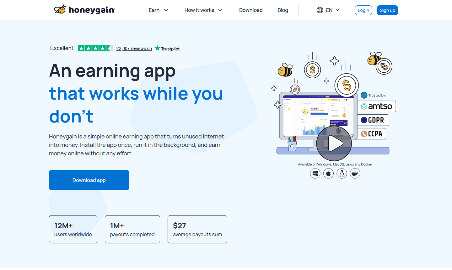 Honeygain is a unique passive income app that turns unused internet bandwidth into earnings. By installing the app, you can monetize spare capacity while it runs quietly in the background. It serves businesses for market research, SEO monitoring, and ad verification, creating a win-win ecosystem.