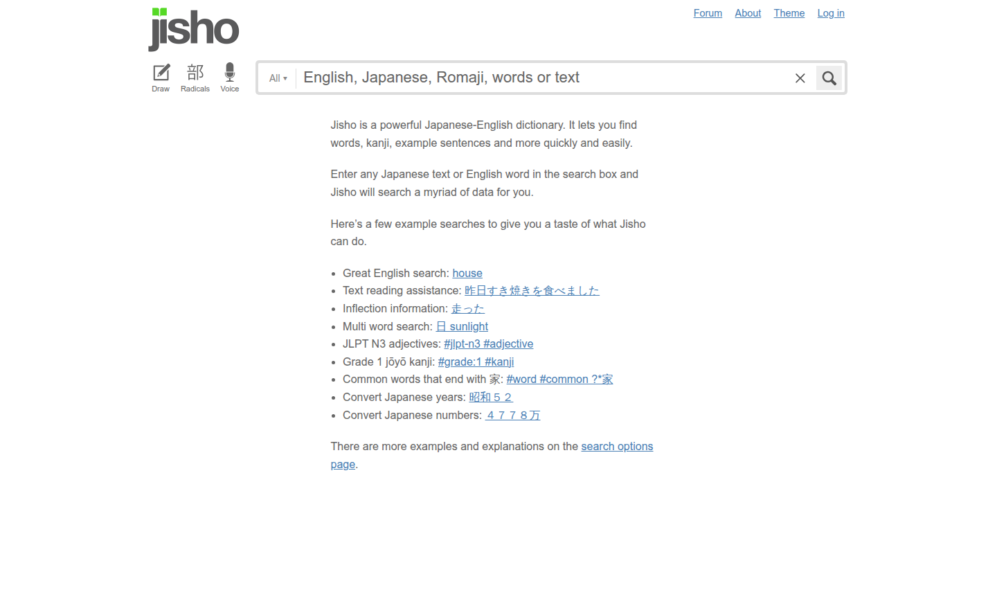 Jisho is a powerful free online Japanese-English dictionary offering comprehensive search for words, kanji, example sentences, and JLPT vocabulary. Ideal for students and language learners.