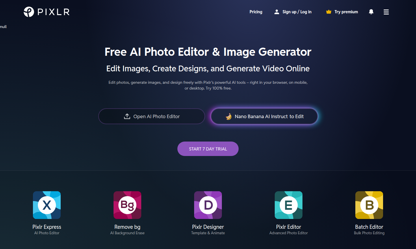 Pixlr is a free online photo editor with AI tools for editing, generating images, and creating designs. Perfect for beginners and professionals.